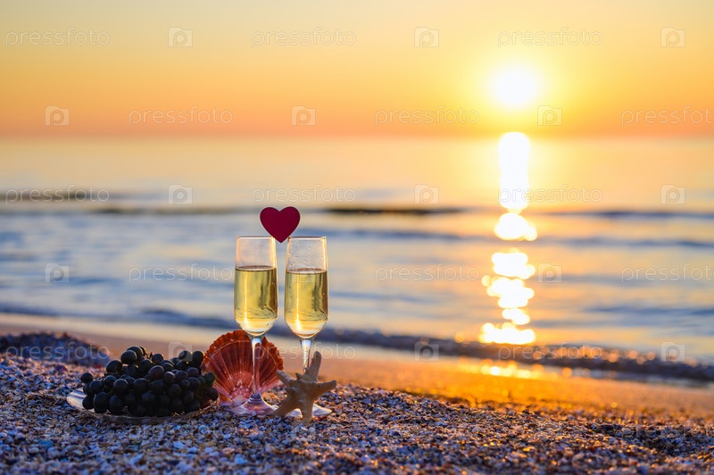 Романтический закат. Бокалы вина для влюбленной пары на пляже. Избирательный фокус на бокале вина