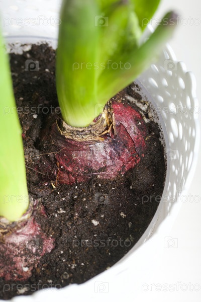 Пересаженные гиацинты. Цветочные луковицы. В пластиковом контейнере. Примулы готовы к выгонке. Крупный план