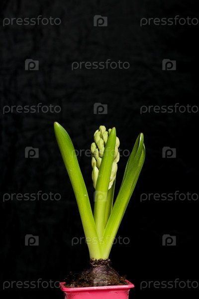 Гиацинты готовы к пересадке. В пластиковых контейнерах. Примулы готовы к выгонке. На черном фоне. Крупный план
