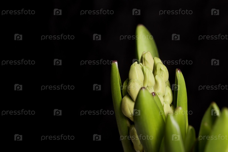 Гиацинты готовы к пересадке. В пластиковых контейнерах. Примулы готовы к выгонке. На черном фоне. Крупный план