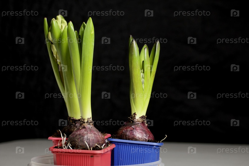 Гиацинты готовы к пересадке. В пластиковых контейнерах. Примулы готовы к выгонке. На черном фоне. Крупный план
