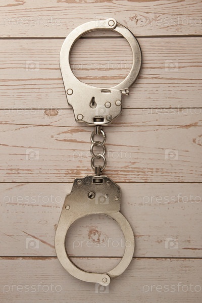 Закрытые наручники лежат на деревянном фоне. Вид сверху. Понятие наказания за измену