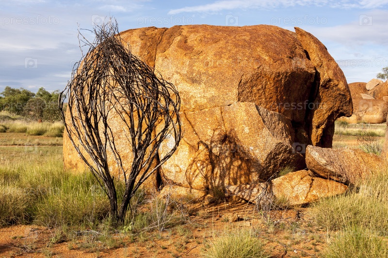 Сухой куст возле большого камня в заповеднике Devils Marbles (Karlu Karlu)
