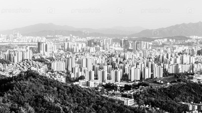 Черно-белый красивый вид на Сеул с горы, Южная Корея