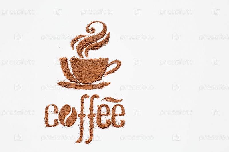 Горячие напитки. Надпись «Кофе» и чашка кофе или чая сделаны из молотого кофе на белом изолированном фоне. Баннер