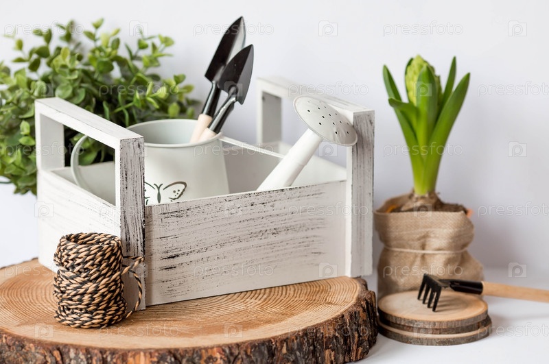 Цветок гиацинта с садовыми инструментами и лейкой изолирован на белом фоне. Концепция садоводства. Высадка. цветы весной