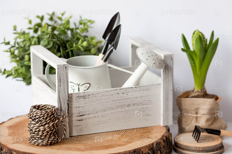 Цветок гиацинта с садовыми инструментами и лейкой изолирован на белом фоне. Концепция садоводства. Высадка. цветы весной