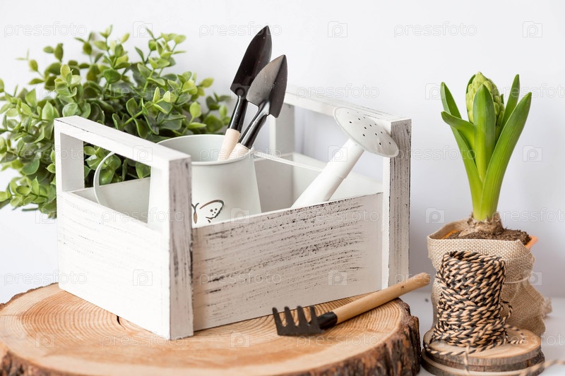 Цветок гиацинта с садовыми инструментами и лейкой изолирован на белом фоне. Концепция садоводства. Высадка. цветы весной