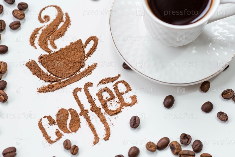 Горячие напитки. Надпись «Кофе», кофейные зерна и чашка кофе или чая сделаны из молотого кофе на белом изолированном фоне. Баннер