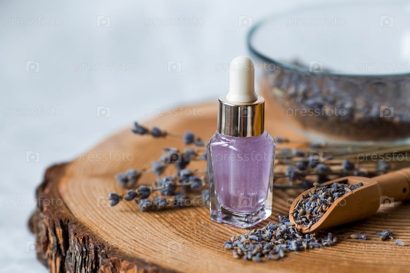 Ароматерапия. Массаж и спа. Косметические бутылки эфирного масла лаванды, сушеные цветы и семена лаванды на деревянной подставке. Натуральная косметика для тела
