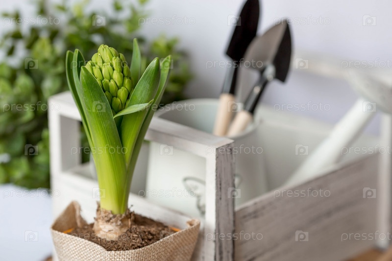 Цветок гиацинта с садовыми инструментами и лейкой изолирован на белом фоне. Концепция садоводства. Высадка. цветы весной