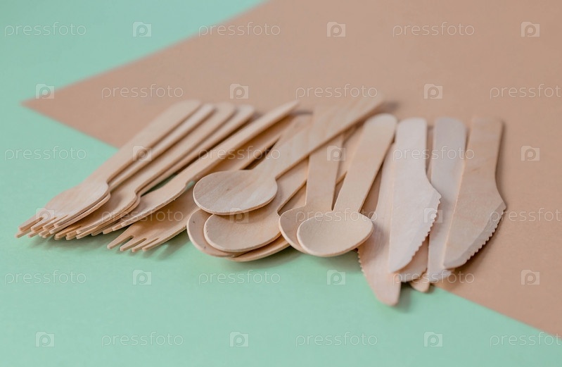 Экологически чистые одноразовые кухонные принадлежности на бежево-зеленом фоне. Деревянные вилки, ложки и ножи. Экология, концепция нулевых отходов