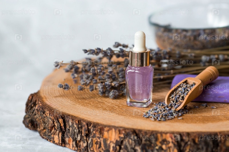 Ароматерапия. Массаж и спа. Косметические бутылки эфирного масла лаванды, сушеные цветы и семена лаванды на деревянной подставке. Натуральная косметика для тела