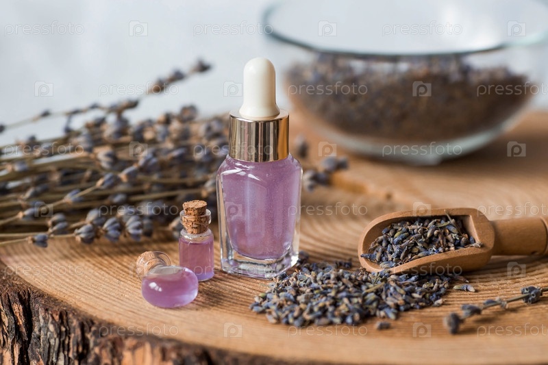 Ароматерапия. Массаж и спа. Косметические бутылки эфирного масла лаванды, сушеные цветы и семена лаванды на деревянной подставке. Натуральная косметика для тела