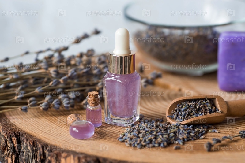 Ароматерапия. Массаж и спа. Косметические бутылки эфирного масла лаванды, сушеные цветы и семена лаванды на деревянной подставке. Натуральная косметика для тела