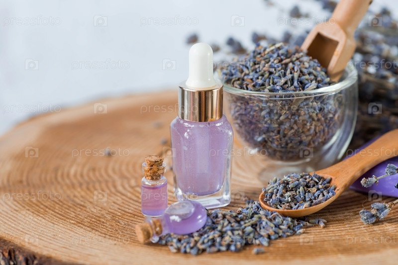 Ароматерапия. Массаж и спа. Косметические бутылки эфирного масла лаванды, сушеные цветы и семена лаванды на деревянной подставке. Натуральная косметика для тела