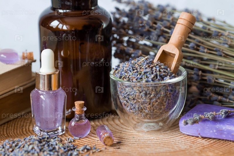 Ароматерапия. Массаж и спа. Косметические бутылки эфирного масла лаванды, старые книги, сушеные цветы и семена лаванды на деревянной подставке. Натуральная косметика для тела