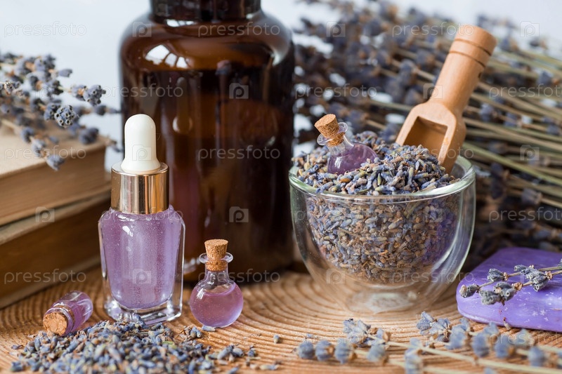 Ароматерапия. Массаж и спа. Косметические бутылки эфирного масла лаванды, старые книги, сушеные цветы и семена лаванды на деревянной подставке. Натуральная косметика для тела