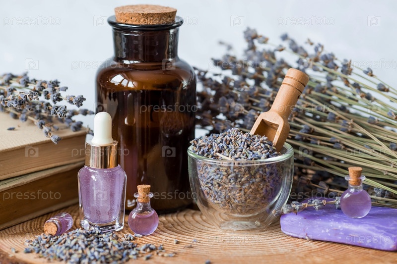 Ароматерапия. Массаж и спа. Косметические бутылки эфирного масла лаванды, старые книги, сушеные цветы и семена лаванды на деревянной подставке. Натуральная косметика для тела