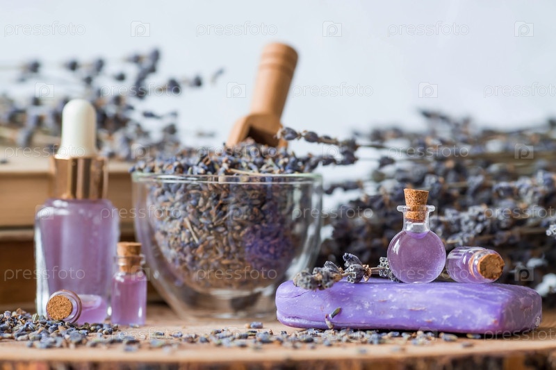 Ароматерапия. Массаж и спа. Косметические бутылки эфирного масла лаванды, старые книги, сушеные цветы и семена лаванды на деревянной подставке. Натуральная косметика для тела