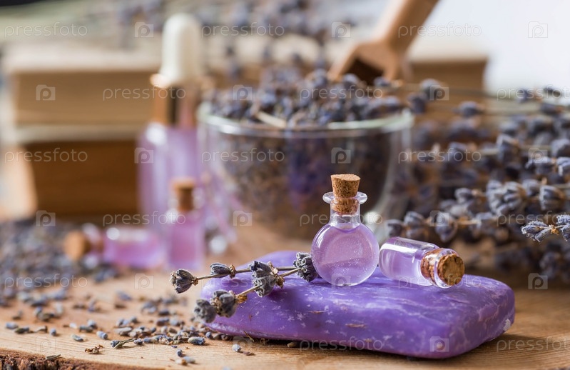Ароматерапия. Массаж и спа. Косметические бутылки эфирного масла лаванды, старые книги, сушеные цветы и семена лаванды на деревянной подставке. Натуральная косметика для тела