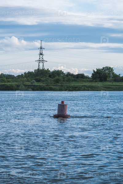 Красный навигационный буй в реке. На фоне травы, леса и опор ЛЭП