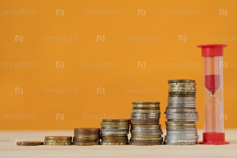 Красные песочные часы и стопки монет стоят в одном ряду в возрастающем порядке. Концепция финансового роста. Оранжевый фон