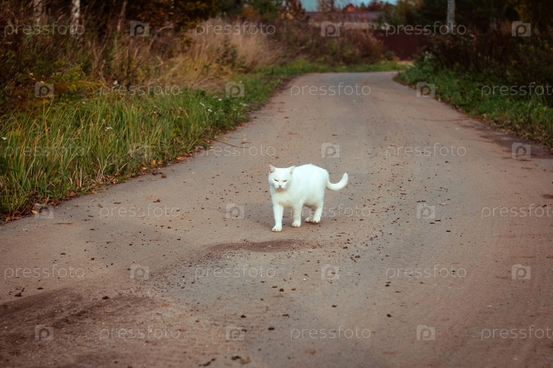 Белая бездомная красивая кошка ходит по дороге, смотрит и щурится. Одинокий бездомный кот ищет дом и хозяина. Передний план. Летний вечер