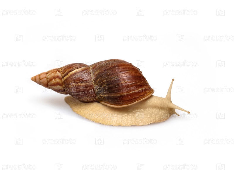 Гигантская африканская улитка Ахатина на белом фоне. Тропическая улитка Achatina fulica с раковиной. Утилита Ахатина в крупном плане. Макро, вид со стороны