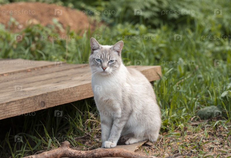 Красивая белая кошка с голубыми глазами сидит на зеленой траве. Кот щурится и смотрит на нас
