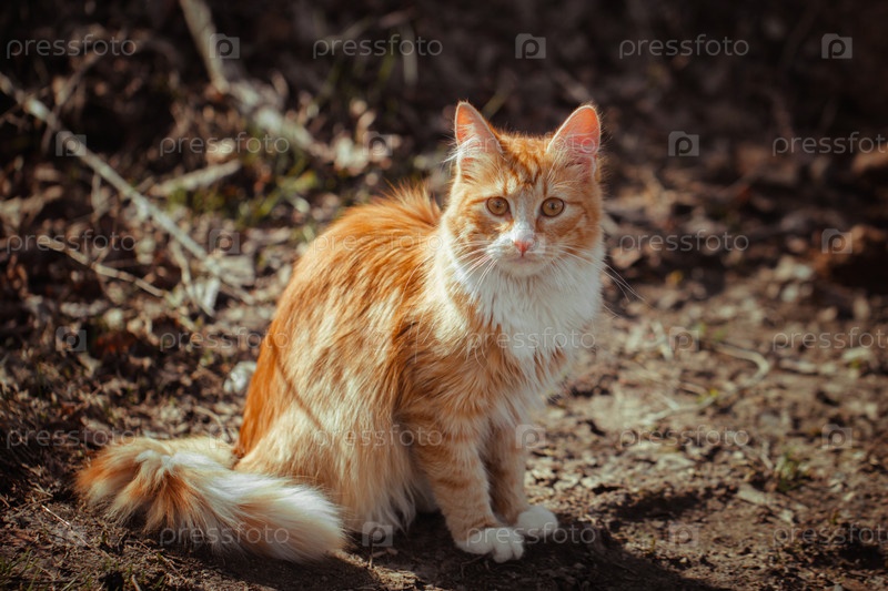 Рыжий полосатый пушистый кот сидит на земле. Бродячий молодой кот с рыжим и белым мехом. Одинокий кот сидит и смотрит на вас, вид спереди. Ранняя весна