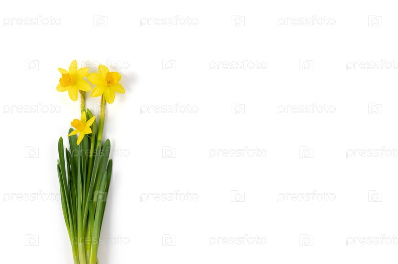 Желтые цветы нарцисса или нарцисс, изолированные на белом фоне. Букет весенних цветов. Скопируйте пространство, вид сверху