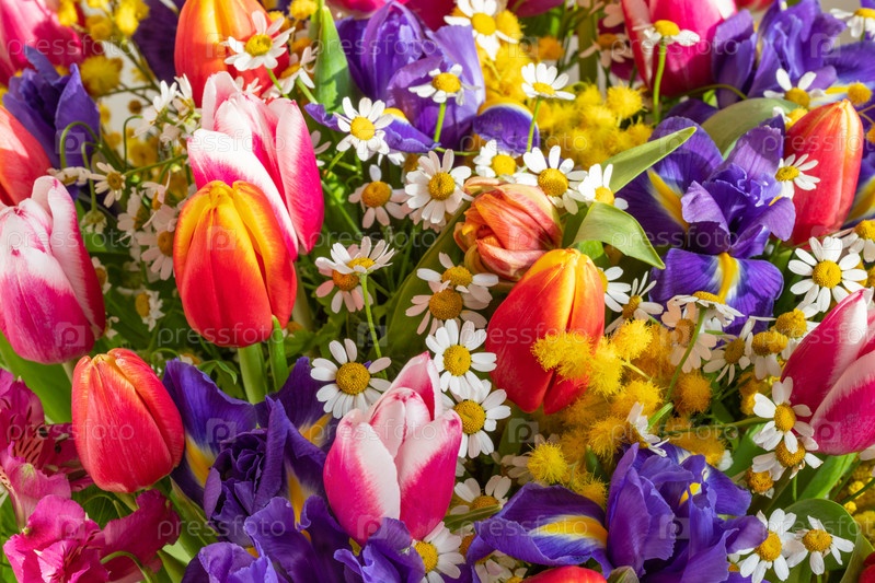 Цветочный узор с тюльпанами, ирисами и ромашками. Красочные весенние цветы. День святого Валентина, фон день матери