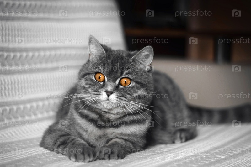 Забавный толстый шотландский прямоухий кот лежит на диване. Красивый серый черный полосатый кот отдыхает. Шотландский прямоухий кот смотрит с любопытством и удивлением. Прекрасные домашние животные. Ярко-оранжевые глаза. Закрыть