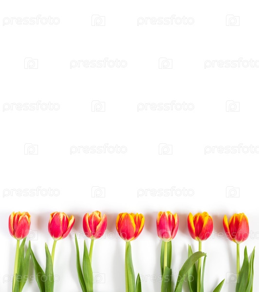 Цветочная рамка с красными тюльпанами на белом фоне. Вертикальная ориентация. Весенняя концепция. Скопируйте пространство, вид сверху, плоская планировка