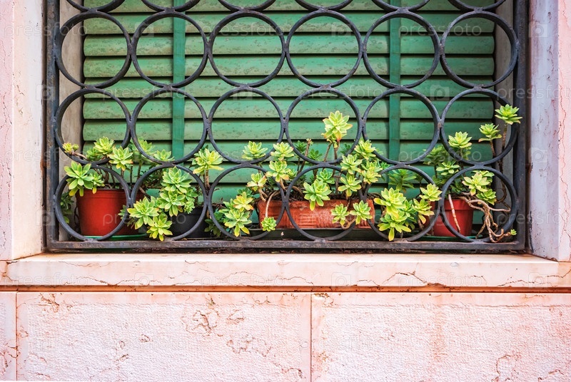 Суккуленты Эхеверия в горшках на подоконнике. Окно, украшенное зелеными растениями в Венеции
