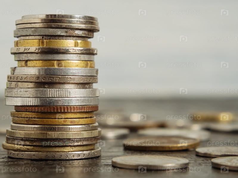 Монеты разных стран уложены друг на друга в виде башни. Рядом на черном фоне разбросаны другие монеты