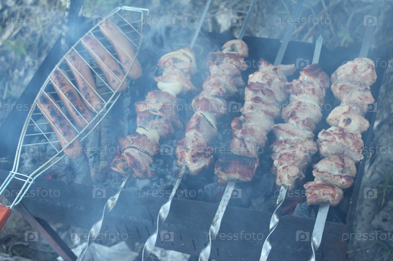 Шашлыки и сосиски на мангале, шашлык в дыму