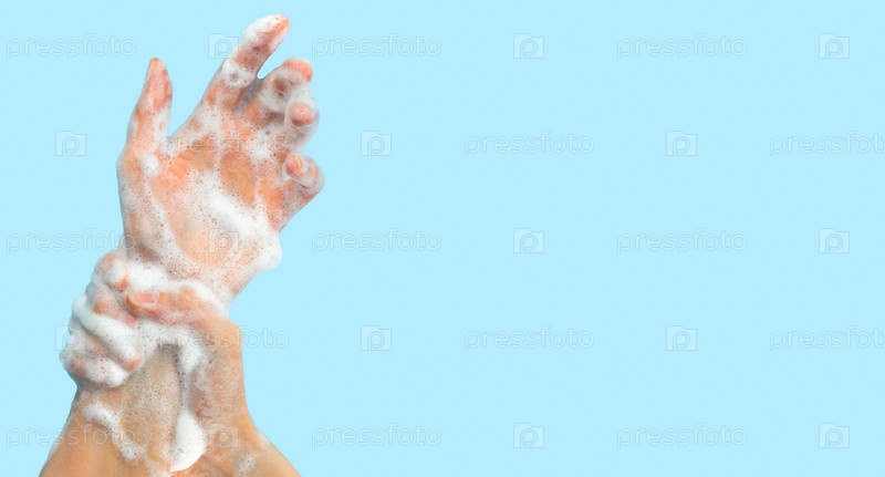 Гигиена рук. Мытье рук с мылом, руки в мыльной пене на синем фоне. Медицинские процедуры, профилактика коронавирусной инфекции, защита от бактерий и вирусов. Баннер, место для текста