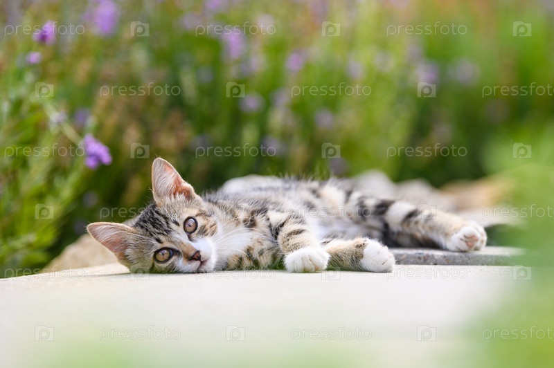 Маленький котенок лежит на дорожке во дворе и смотрит в камеру