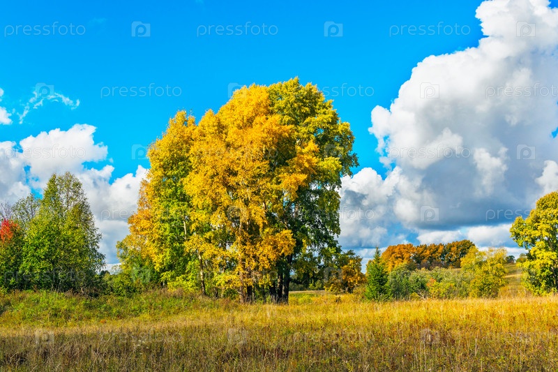 Пейзаж с огромными тополями с пожелтевшей листвой в осенний день