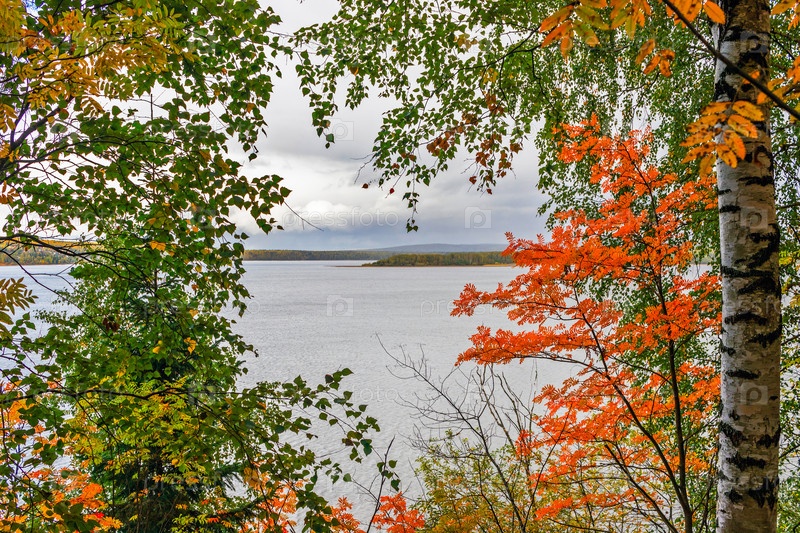 Вид с высокого берега реки Чусовой через ветки деревьев в осенний день