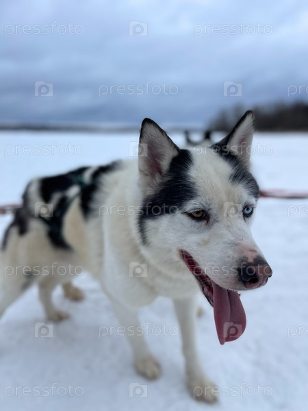 Черно-белая хаски в упряжке снаружи