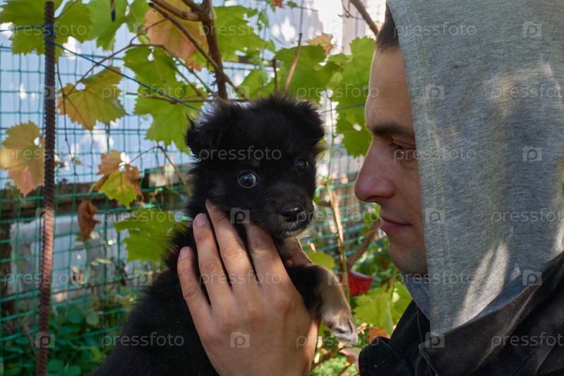 Щенок сидит на руках человека в капюшоне. Маленькая черная собака смотрит прямо в объектив камеры