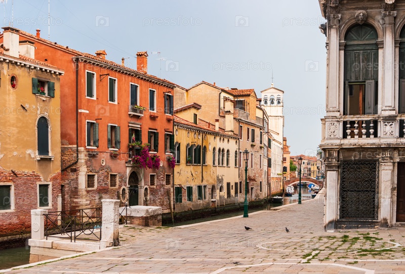Венеция, Италия. Живописная Виниканская улица со старыми итальянскими домами и мостом через канал
