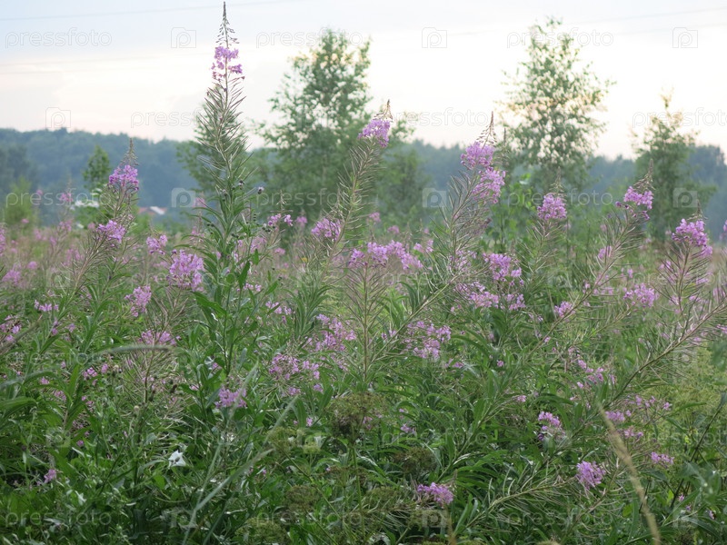 Сумерки сгущаются над летним полем, иван-чай цветет