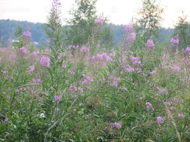 Сумерки сгущаются над летним полем, иван-чай цветет