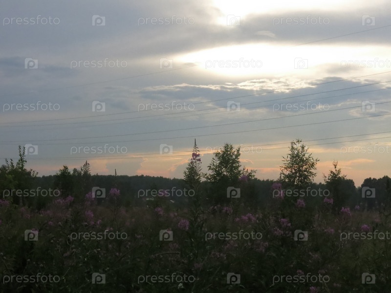 Сумерки сгущаются над летним полем, иван-чай цветет