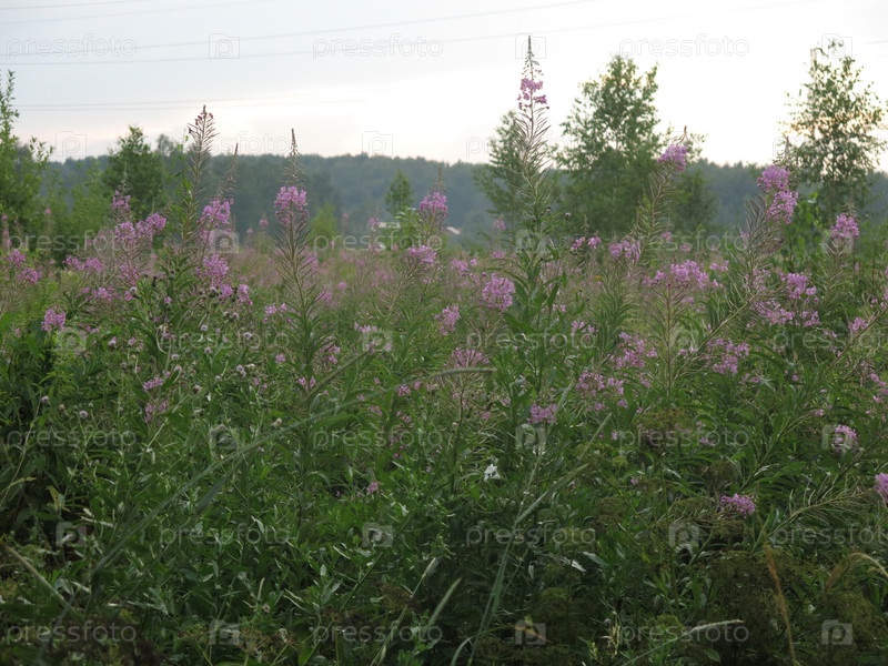 Сумерки сгущаются над летним полем, иван-чай цветет
