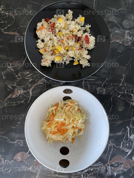 Вид сверху на тарелки с салатом из свежей капусты и моркови и пловом, который находится на столе